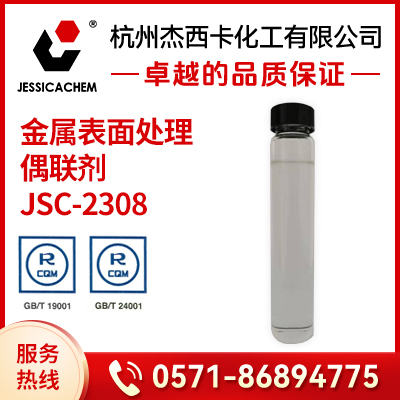 硅烷偶联剂JSC-2308和JSC-2309属于新型的硅烷偶联剂,其在同一分子结构中具有多个硅烷结构,它们一个分子上有比普通硅烷偶联剂更多个烷氧基。因此,KH-2308和KH-2309能在无机材料表面形成更高的交联密度;同时该产品水解后所形成的硅醇比普通硅烷偶联剂所形成的硅醇相比酸性更强,因此能与金属、无机材料表面的羟基所形成更牢固的共价键,且不易水解。
